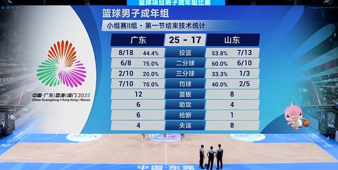 节中阶段轮转杜锋开启五上五下,徐杰贺希宁焦泊乔领衔二阵容,贺希宁、焦泊乔上来状态不错二人连得6分,帮助广东快速拉开分差18-11打停山东,但第一节打完,坐拥豪华阵容的广东队仅取得25-17领先,防守端没问题(逼出山东8次失误),问题出在了糟糕的三分命中率上,第一节全队三分仅10中2。