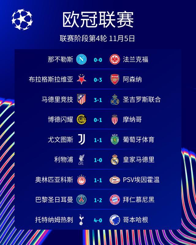 至此,11月5日的欧冠联赛阶段第4轮的9场比赛战罢,结果分别为:那不勒斯0-0法兰克福、布拉格斯拉维亚0-3阿森纳、马德里竞技3-1圣吉罗斯联合、博德闪耀0-1摩纳哥、尤文图斯1-1葡萄牙体育、利物浦1-0皇家马德里、奥林匹亚科斯1-1PSV埃因霍温、巴黎圣日耳曼1-2拜仁慕尼黑、托特纳姆热刺4-0哥本哈根!