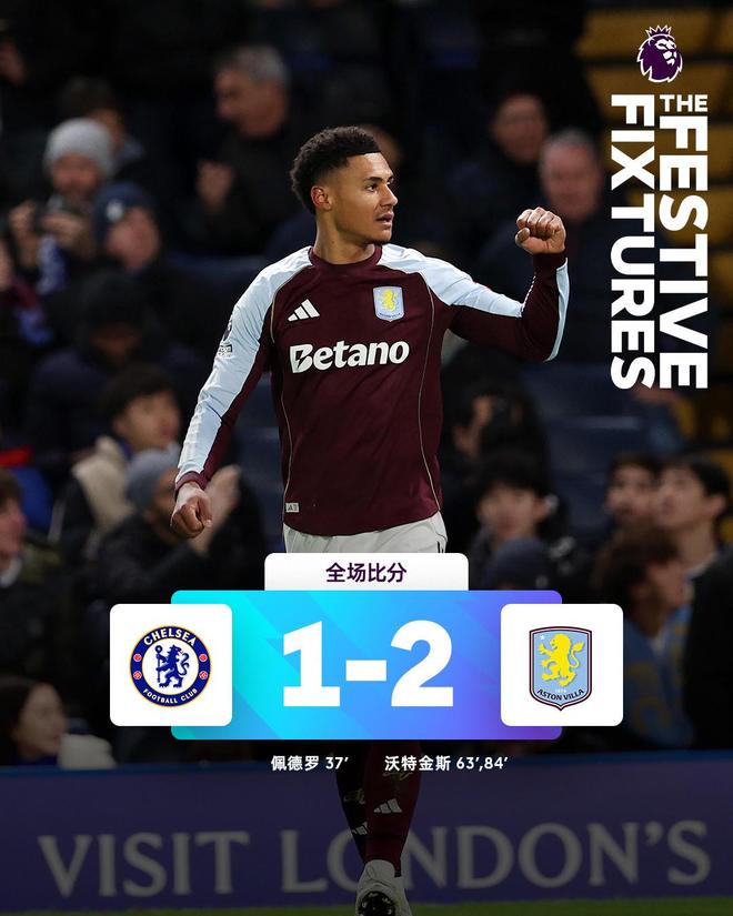 在2025赛季英超第18轮焦点战中,阿斯顿维拉客场2-1逆转切尔西,替补登场的沃特金斯梅开二度导演惊天大逆转,帮助球队追平111年队史最长连胜纪录。
