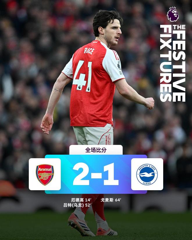 比赛结束,阿森纳主场2-1战胜布莱顿。