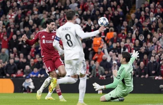 比赛从一开始就进入了利物浦熟悉的快节奏。上半场,利物浦中场索博斯洛伊便成为皇马防线的噩梦。他先是机敏包抄抢点,被库尔图瓦反应神速用脚挡出;随后又一脚势大力沉的远射,再次被这位比利时门神飞身化解。整个上半场,利物浦的进攻一浪高过一浪,而站在他们面前的,仿佛是一堵无法逾越的高墙。