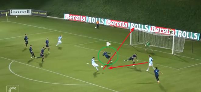 第14分钟,对手中路大禁区弧顶处得球,直接起脚重炮轰门,皮球重重击中横梁弹出。对手在整个调整+射门的过程当中,只有亚历克西乌狂奔五米试图放铲封堵——虽然没堵住,但这种防守态度,是国米U23非常稀缺的。
